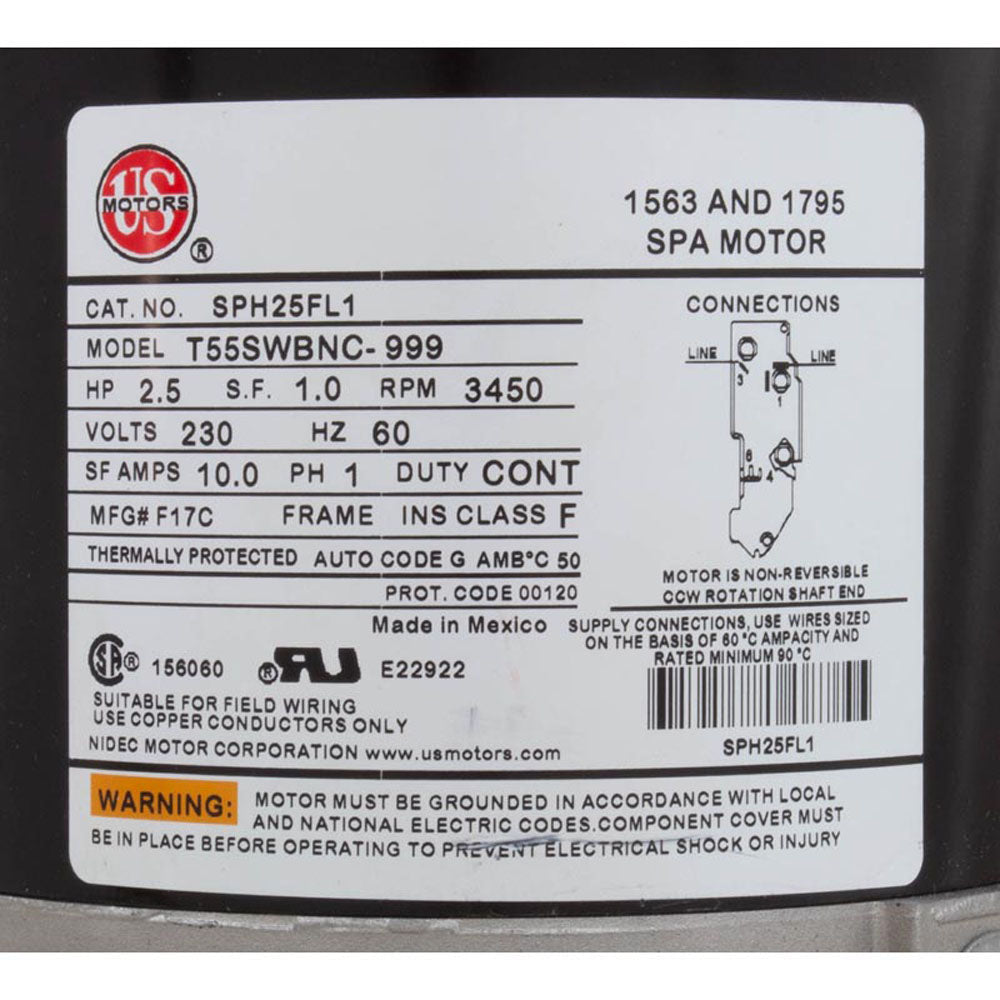 Nidec SPH25FL1 Motor, Nidec/US Motor, 2.5hp, 230v, 1-Speed, 48Y Frame