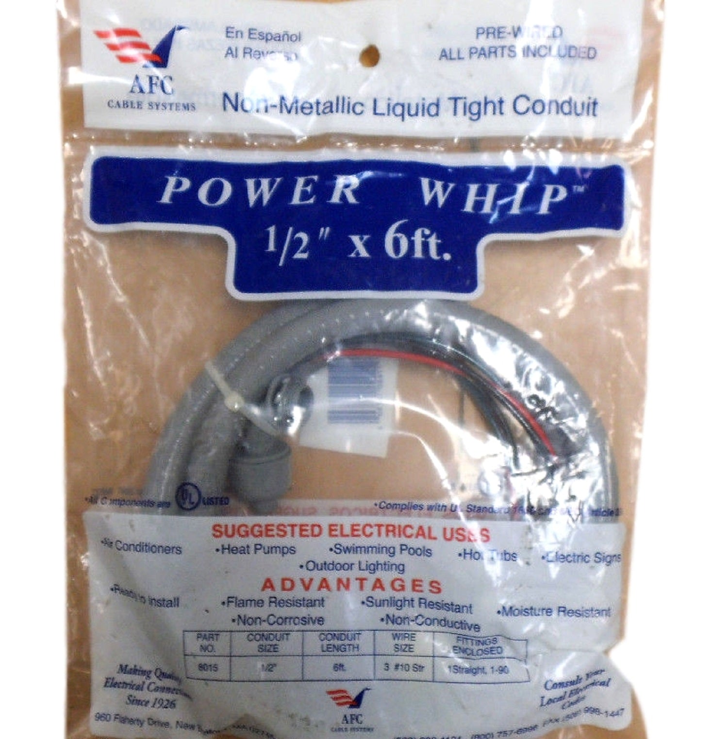 AFC 8015 Pre-Wired Non-Metallic Liquid Tight Conduit 1/2" x 6' Moisture Resist