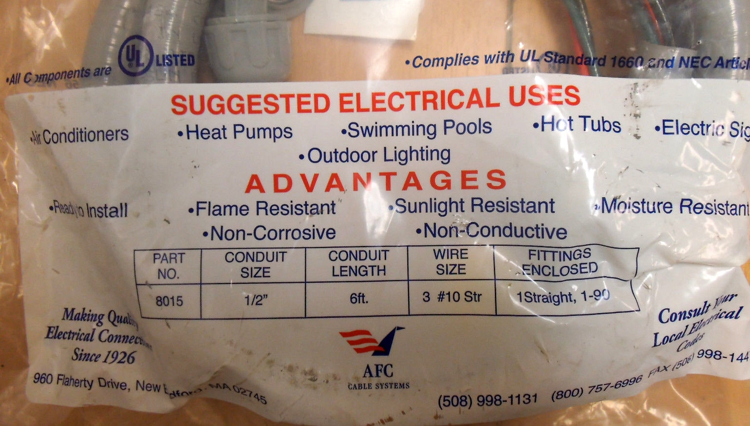 AFC brand non-metallic liquid tight conduit. For use with air conditioners, heat pumps, swimming pools, hot tubs, electric signs, outdoor lighting.