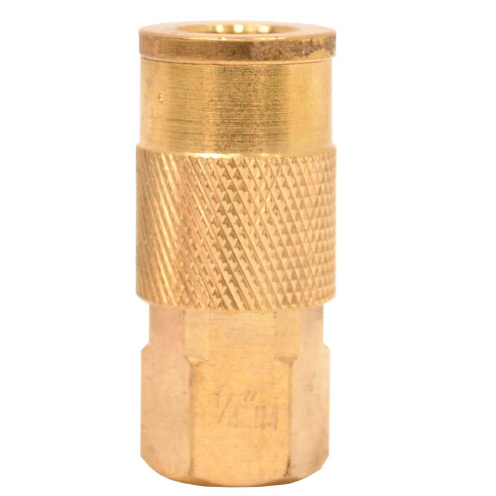 The Husky 1/4 in. x 1/4 in. NPT Female Industrial Coupler connects with a 1/4 in. industrial-style plug for quick, easy changes. Compatible with most air hose and piping fittings, the couple has heat-treated lock balls and a brass construction for long tool life.
